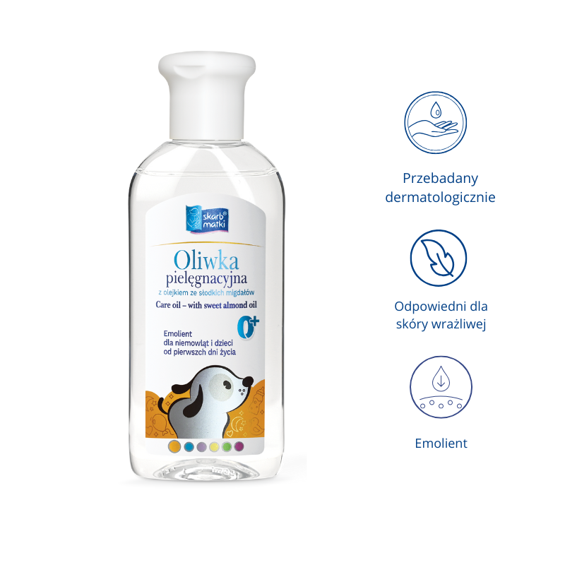 Oliwka pielęgnacyjna z olejkiem ze słodkich migdałów: Zabezpiecza skórę przed otarciami i odparzeniami. Nawilża i natłuszcza.