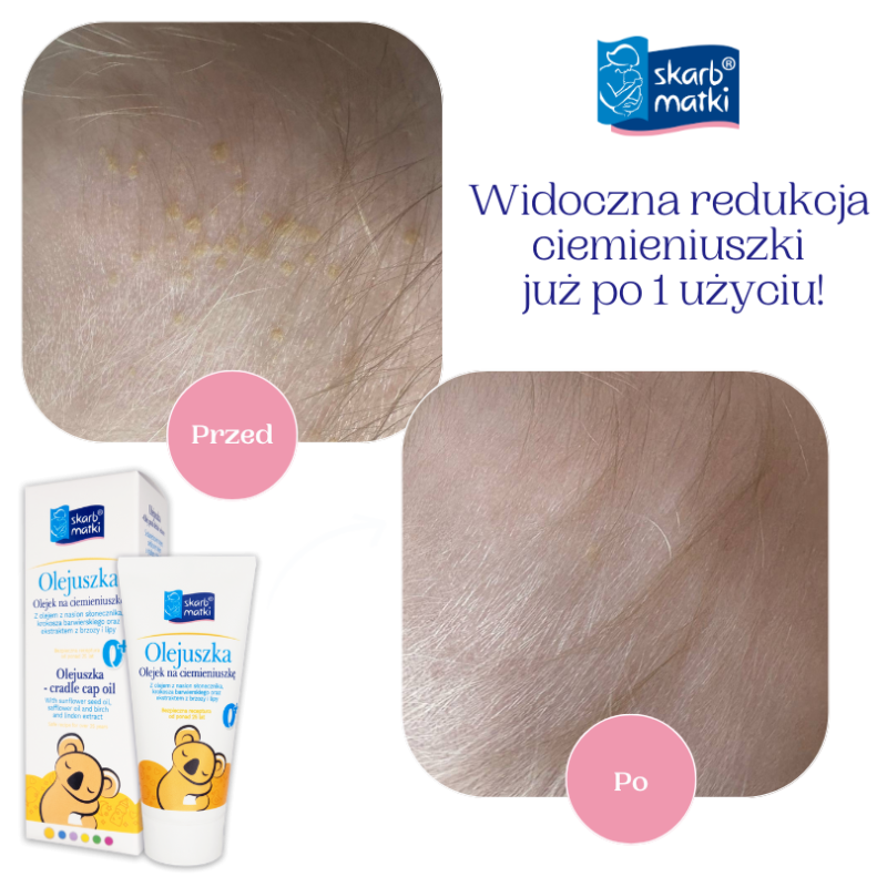 Olejuszka to specjalistyczny olejek na ciemieniuchę, stworzony z myślą o delikatnej pielęgnacji skóry głowy niemowląt i dzieci już od pierwszych dni życia. Preparat oparty jest na naturalnych składnikach roślinnych, takich jak olej z krokosza, ekstrakt z liści brzozy oraz ekstrakt z kwiatu lipy, które skutecznie łagodzą objawy ciemieniuchy i wspierają codzienną pielęgnację skóry głowy malucha. Skarb Matki Olejuszka to innowacyjny, naturalny olejek przeznaczony do pielęgnacji skóry głowy niemowląt i dzieci z objawami ciemieniuchy. Produkt został opracowany z myślą o bezpieczeństwie i skuteczności już od pierwszych dni życia dziecka, zapewniając delikatną, a zarazem efektywną pomoc w walce z łuskami i podrażnieniami skóry głowy.